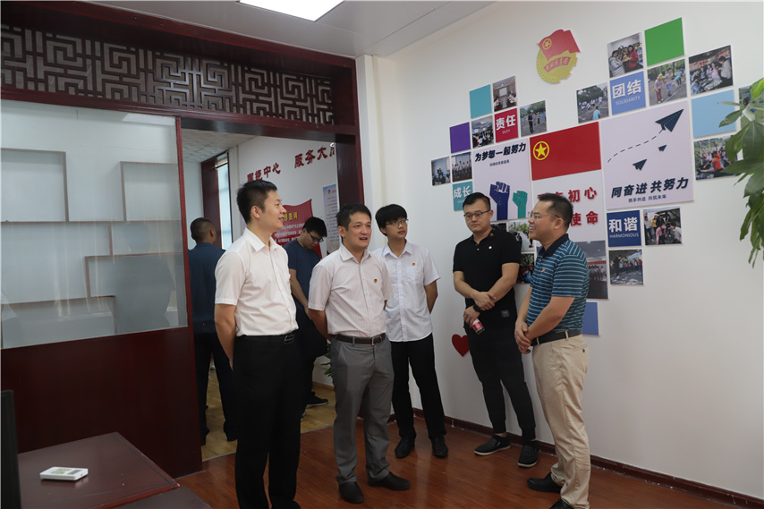 ▲共青團(tuán)柳州市委員會副書記李玉輝(前排中)、魚峰區(qū)委副書記王漢強(qiáng)(左二)參觀育才辦公環(huán)境