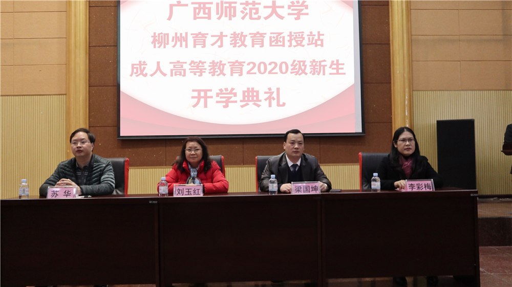 1月11日上午,廣西師范大學(xué)柳州育才函授站成人高等教育2020級新生開學(xué)典禮在柳州本部順利舉行。廣西師范大學(xué)繼續(xù)教育學(xué)院院長劉玉紅教授、學(xué)歷部主任蘇華、集團(tuán)總校校長梁國坤、集團(tuán)聯(lián)合黨委紀(jì)檢委員、副校長李彩梅以及來自柳州各行業(yè)的100多名新生代表參加了開學(xué)典禮。