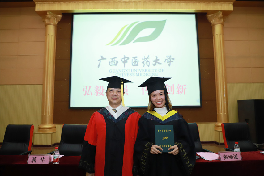 廣西中醫(yī)藥大學成教院副院長黃瑞誠宣讀優(yōu)秀畢業(yè)生表彰決定,隨后頒發(fā)優(yōu)秀畢業(yè)生榮譽證書、畢業(yè)證書,韋艾凌院長為獲得學士學位的學生代表授予學位證書、撥穗正冠。